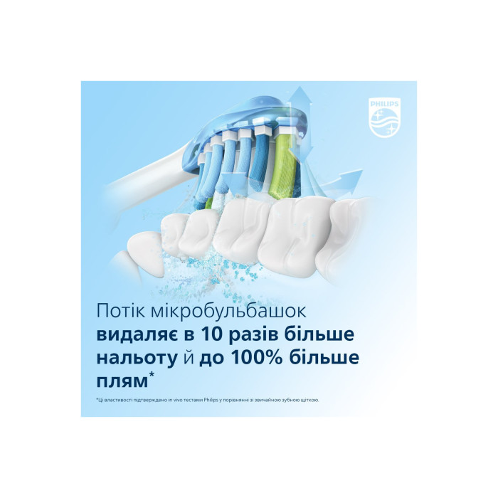 Благодаря звуковой технологии эффективные выметающие движения – 62 000 в минуту – создают пузырьки, устраняющие налет между зубами и вдоль линии десен. До 10 раз более эффективно удаление налета по сравнению с обычной ручной зубной щеткой.