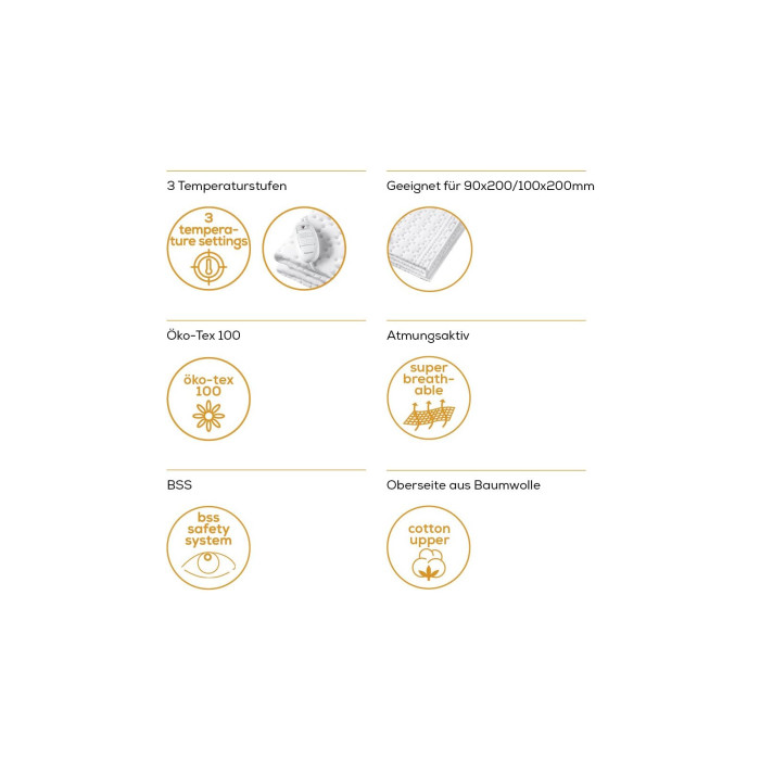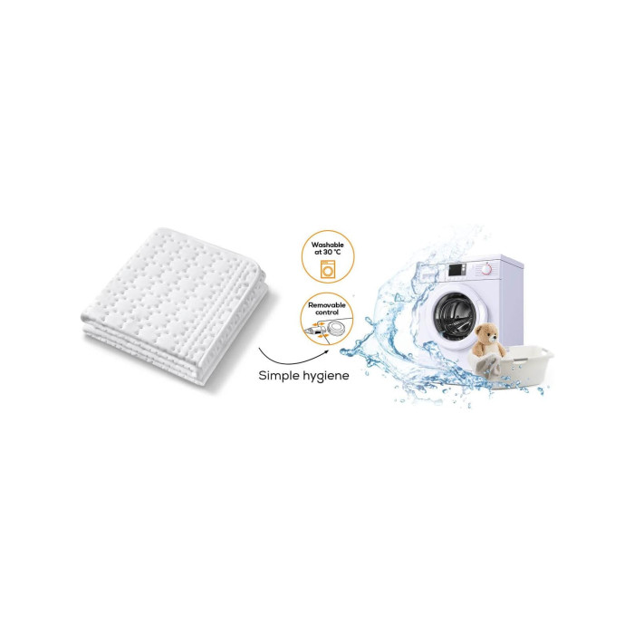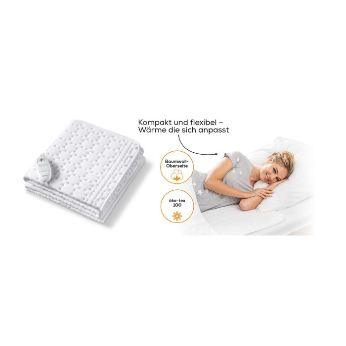Электрическая простыня небольшого размера. Расслабляет мышцы, улучшает качество сна. Верхняя сторона из дышащего хлопка, низ – нетканый материал. Система безопасности Beurer (BSS). Отображение температуры с подсветкой. Съемный переключатель. Материал верха: хлопок; материал подкладки: флис
