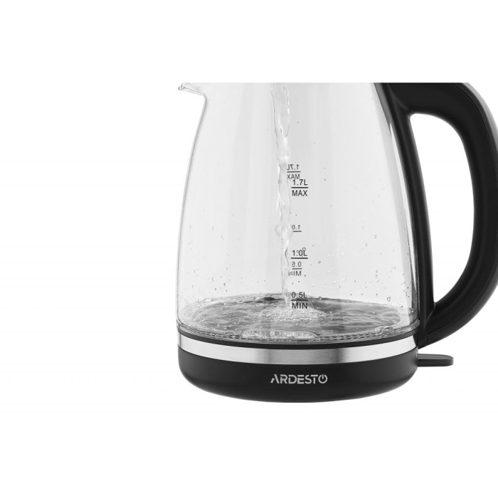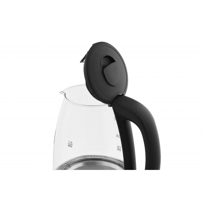 Фильтр накипи легко моется, а для комфортного использования есть удобная ручка и клавиша открытия крышки. За включение отвечает отдельная клавиша, расположенная в нижней части чайника. Длина провода подставки составляет 80 см. Работа чайника сопровождается LED-подсветкой синего цвета. Нагревательный элемент — скрытый. Его эффективное расположение вместе с мощностью в 2150 Вт обеспечивает быстрое достижение заданной температуры. За надежную защиту от перегрева и автоматическое отключение при отсутствии воды отвечает контроллер Strix. Его ресурс — до 12 000 рабочих циклов, что равняется 10 годам интенсивного использования устройства.