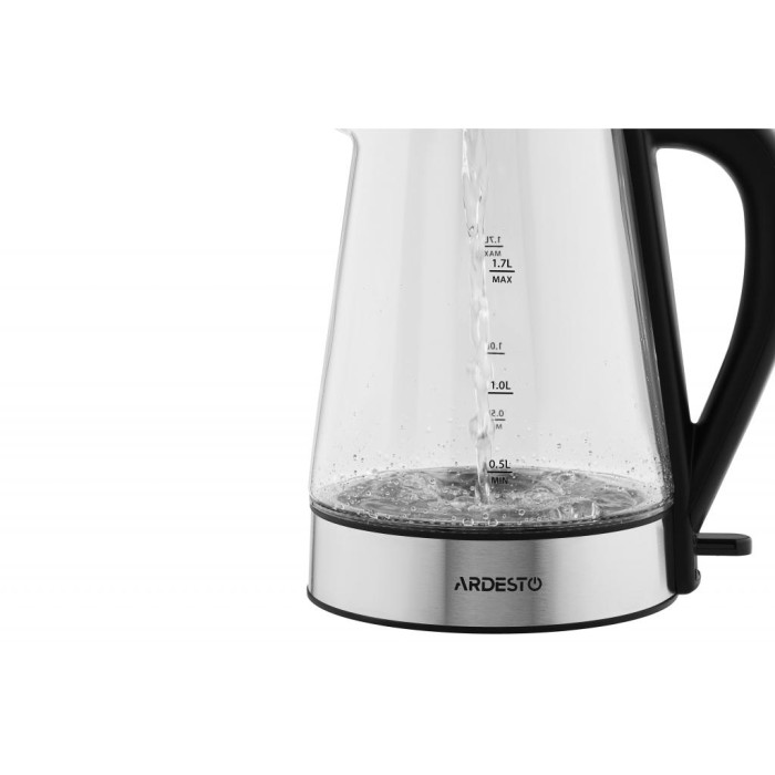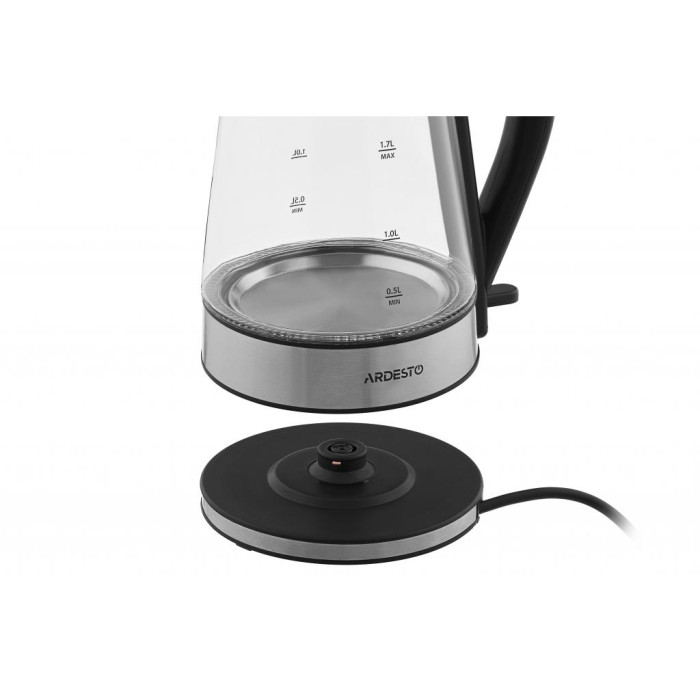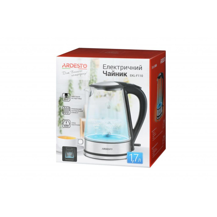 Фильтр накипи легко моется, а для комфортного использования есть удобная ручка с кнопкой открытия крышки. За включение отвечает отдельная клавиша, расположенная в нижней части чайника. Длина провода подставки составляет 80 см. Работа чайника сопровождается LED-подсветкой синего цвета. Нагревательный элемент — скрытый. Его эффективное расположение вместе с мощностью в 2150 Вт обеспечивает быстрое достижение заданной температуры. За надежную защиту от перегрева и автоматическое отключение при отсутствии воды отвечает контроллер Strix. Его ресурс — до 12 000 рабочих циклов, что равняется 10 годам интенсивного использования устройства.