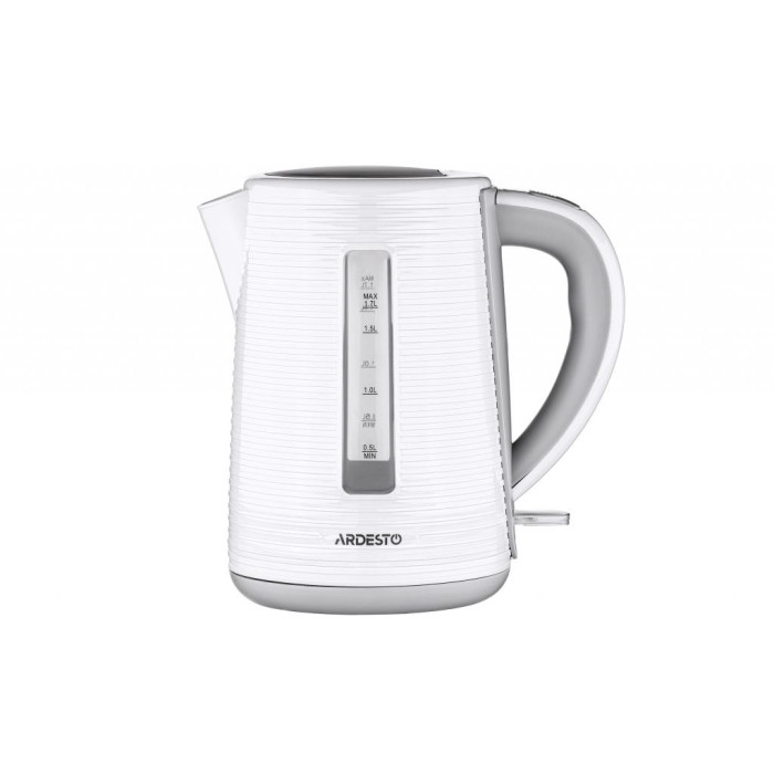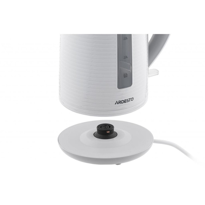 Шкала объема имеет удобные отметки, а для комфортного использования есть ручка с кнопкой открытия крышки. За включение отвечает отдельная клавиша, расположенная в нижней части чайника. Длина провода подставки составляет 80 см.