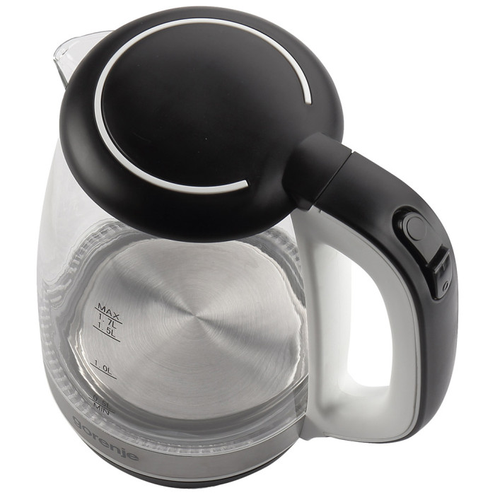 Электрочайник Gorenje K17GLBW выпускается в прозрачном стеклянном корпусе с чёрно-белой ручкой, крышкой и основанием. В него вмещается 1,7 литра воды, уровень которой контролируется визуально и по нанесённым отметкам шкалы. Таким образом, можно наливать ровно столько воды, сколько необходимо. Для этого следует открыть откидную защёлкивающуюся крышку, нажав кнопку на ручке. Жидкость в устройстве нагревается дисковым элементом мощностью 2200 Вт, который включается переключателем, при этом загорается сигнальный индикатор. В носике прибора установлен съёмный и моющийся фильтр, который не только задерживает накипь, но и предотвращает капание при разливе воды по чашкам. Прорезиненное нескользящее основание позволяет модели вращаться на 360 градусов и содержит отделение для сматывания кабеля питания длиной 0,6 метра. Электрочайник Gorenje K17GLBW снабжён защитой от перегрева и выкипания и автоматически отключается, когда вода нагревается до 100С.