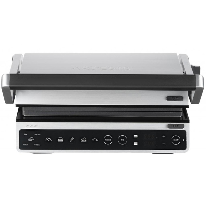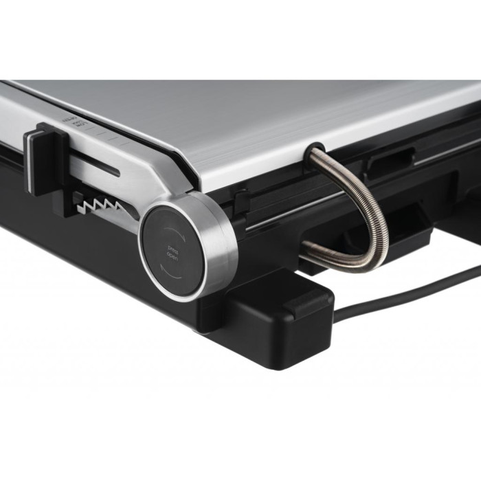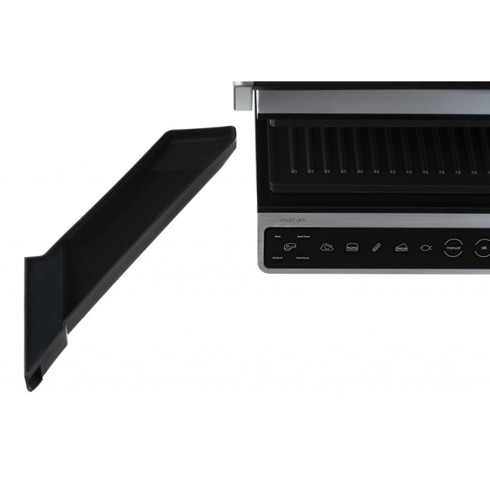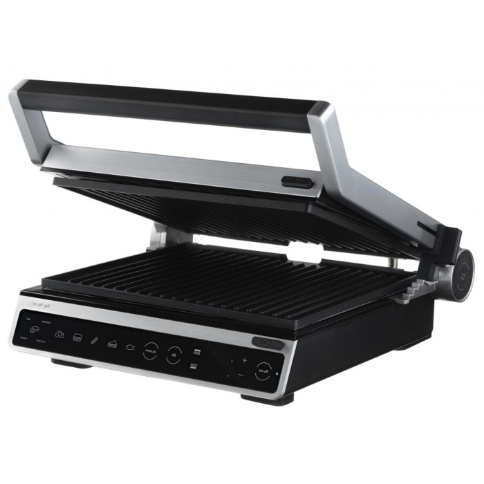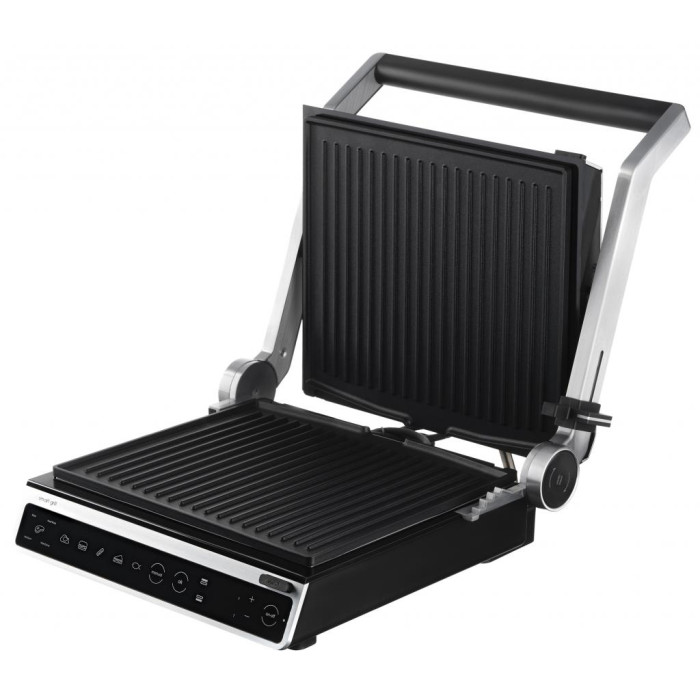Электрогриль мощностью 2000 Вт, с сенсорным управлением, шестью автоматическими режимами приготовления, регулировкой температуры, степенью прожарки и готовности, а также автоматическим определением толщины продукта. Полное раскрытие пластин конструкции позволяет использовать обе поверхности для одновременного приготовления продуктов, с возможностью отдельной установки температуры для каждой пластины. Съемные пластины с антипригарным покрытием и лоток для сбора жира и других отходов обеспечивают удобную и простую очистку и мытье устройства