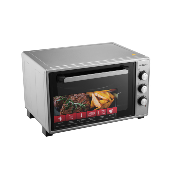 Электропечь ARDESTO MEO-N40GR имеет мощность 1300 Вт, что позволяет быстро достигать нужной температуры в печи. Объем внутренней камеры составляет 40 л, чего достаточно для приготовления разных порций еды