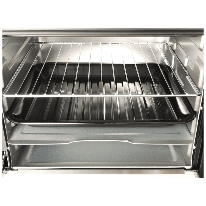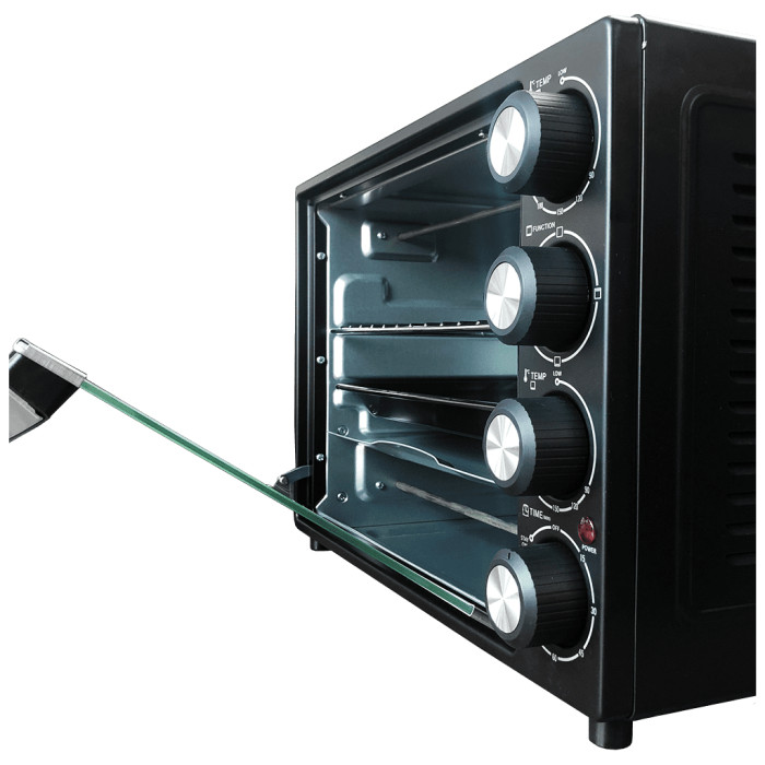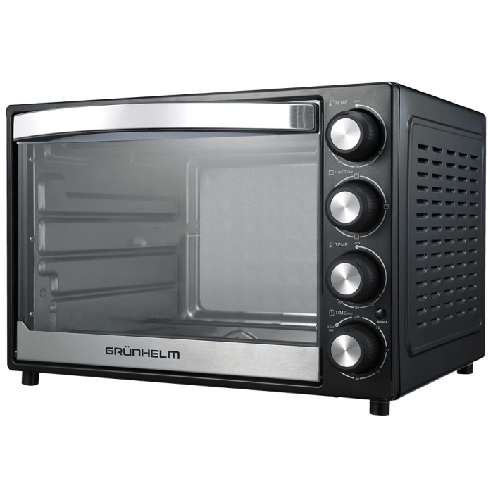 Печь электрическая Grunhelm GN44AG имеет нагревательные элементы ТЭН общей мощностью 1.5 кВт, управляется механически с помощью 4 регуляторов (настройка верхнего и нижнего нагревательного элемента, таймер до 90 мин и выбор одной из четырех программ. Максимальная температура нагрева 230°С, общий объем 44 л. Внутри камеры есть подсветка, снаружи индикатор включения, при завершении готовки можно услышать звуковое оповещение. Стеклянную дверцу можно зафиксировать в двух положениях. В комплекте есть все необходимое, чтобы начать приготовление: противень с антипригарным покрытием, металлическая решетка, поддон для крошек, съемная ручка под лист и решетку.