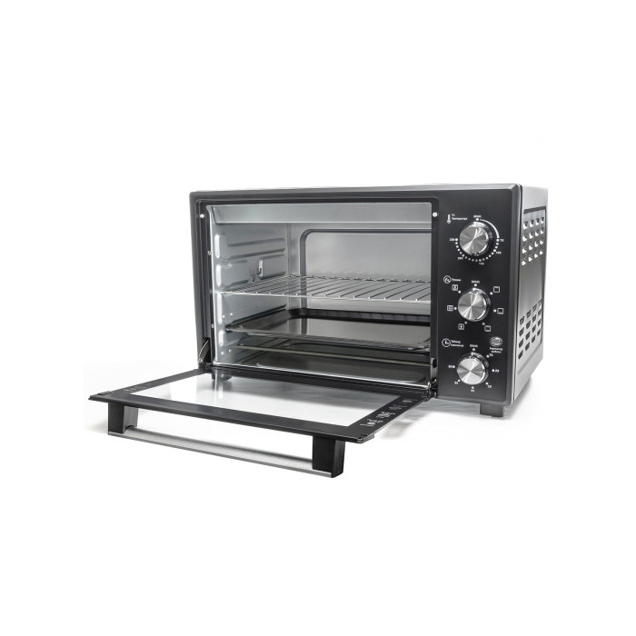 На лицевой панели электропечи расположен механический регулятор температуры. Термостат позволяет устанавливать температуру от 70 до 250°С. Такая возможность настройки теплового режима позволяет готовить блюда как при сильном нагревании (при 250°С), так и при легком термическом воздействии. Блюда не пригорают даже при высокой температуре, потому что горячий воздух внутри печи распределяется равномерно.