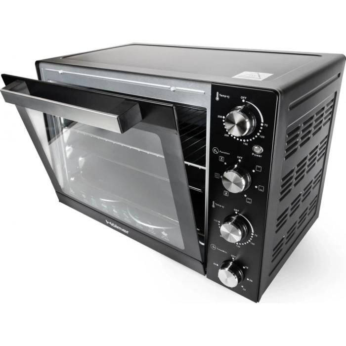 Под стать внешности, не разочаровывают и возможности электропечки Holmer HEO-162CRL. Высокая мощность нагрева, выбор режимов работы, наличие гриля и конвекции. Все это атрибуты полногабаритной техники. Максимальная температура нагрева доходит до 250 градусов. Поэтому вряд ли вы столкнетесь с каким-то ограничениями в плане функциональности. Дверка духовки фиксируется в открытом положении. Но также есть промежуточная фиксация под углом в 20 градусов.