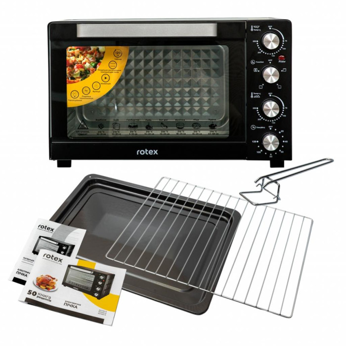 Покупая духовку Rotex ROT350-B нет необходимости в дополнительном инвентаре для приготовления. Входящие в комплект круглый и прямоугольный противень дают возможность готовить все, от тортов до целых больших кусков мяса. А если фантазия иссякла, книга с рецептами, которая также входит в комплект, позволит разнообразить семейное меню.