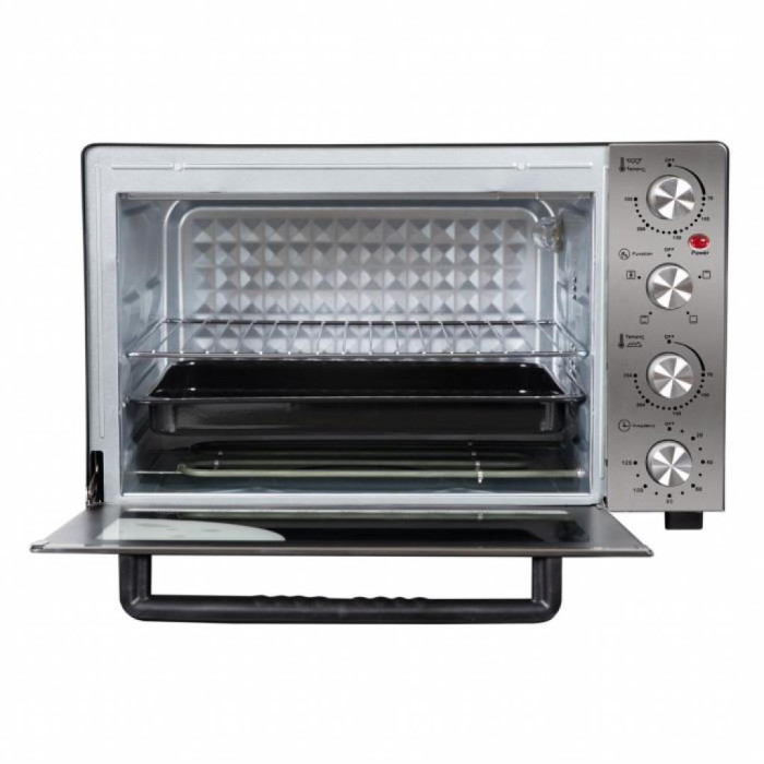 На ровную поверхность стола прибор надежно устанавливается благодаря нескользящим ножкам. Дверца электропечи открывается легко и плавно с помощью горизонтальной ручки.