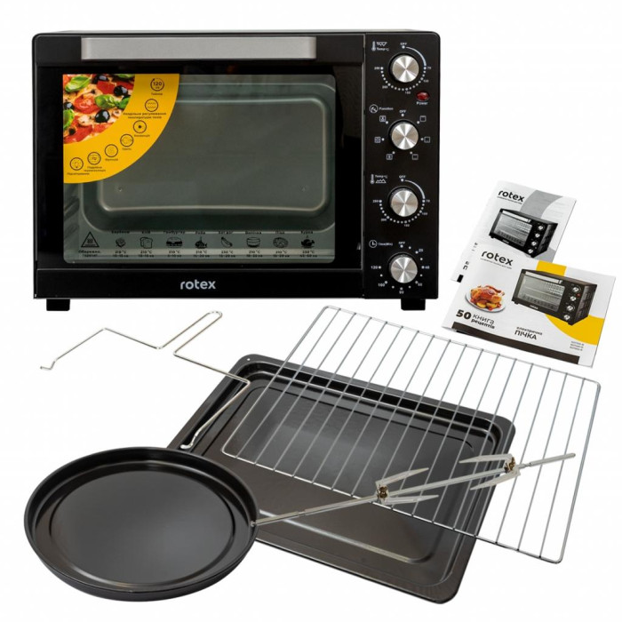 Покупая духовку Rotex ROT650-B нет необходимости в дополнительном инвентаре для приготовления. Входящие в комплект круглый и прямоугольный противень дают возможность готовить все, от тортов до целых больших кусков мяса. Вертел для гриля обеспечит равномерное запекание с каждой стороны, в сочетании с режимом конвекции можно рассчитывать на блюдо, не хуже ресторанного. А если фантазия иссякла, книга с рецептами, которая также входит в комплект, позволит разнообразить семейное меню.