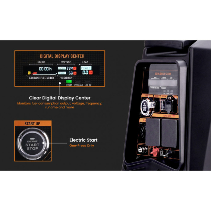 - Электрический запуск/дистанционный запуск: быстро и легко запустите двигатель, нажав кнопку. Вы также можете легко запустить или выключить портативный генератор с помощью дистанционного брелка.