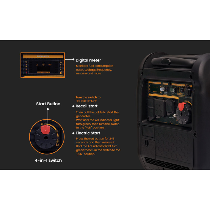 3. Все портативные инверторы функционально протестированы на заводе и могут содержать минимальный остаточный запах масла и / или топлива; Совместимость с EPA и CARB.