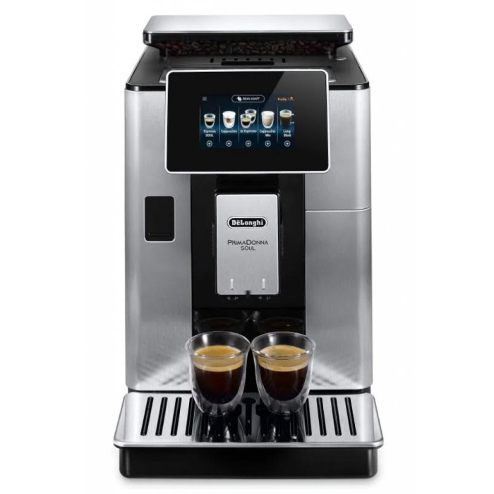 Кофемашина автоматическая Delonghi PrimaDonna Soul ECAM 610.74.MB производится в современном стильном дизайне. Настольный аппарат мощностью 1450 Вт создаёт давление 19 бар и готовит напитки из зёрен и молотого кофе. Вода заливается в съёмный резервуар объёмом 2,5 литра и очищается фильтром, а для зёрен предназначен контейнер вместимостью 500 грамм. Встроенная мельница с регулируемой степенью помола подробит зёрна непосредственно перед приготовлением. Любители капучино и других напитков с молоком смогут готовить их в автоматическом режиме. Модель оснащена технологией Bean Adapt, корректирующей параметры приготовления в зависимости от типа, происхождения, степени обжарки и других характеристик кофе. Два термоблока – для воды и для пара и молока – поддерживают температуру экстракции в пределах от 88С до 96С. Автоматическая кофемашина Delonghi PrimaDonna Soul ECAM 610.74.MB оборудована системой самоочистки, а управляется цветным сенсорным TFT-дисплеем с диагональю 4,3 дюйма.