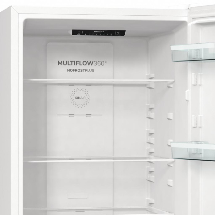 Ионизатор IonAir создает внутри прибора отрицательно заряженные ионы, которые равномерно распределяются по всему холодильному отделению с помощью новой системы вентиляции MultiFlow 360°. Воздух, обогащенный анионами, сохраняет вкус продуктов и удаляет неприятные запахи.