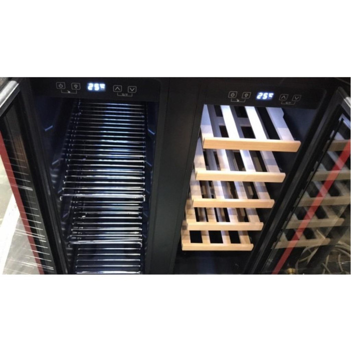 Внутренние перекладины сделаны в виде деревянных и металлических полок, которые имеют отделение под каждую из бутылок, хранящихся внутри. Дерево не создает температурных перепадов, т.к. оно нейтрально, метал же наоборот удерживает холод. Внешнее оформление также только выигрывает от такого решения. Прочность полочек позволяет расположить внутри 20 стандартных емкостей вина и 63 с пивом.