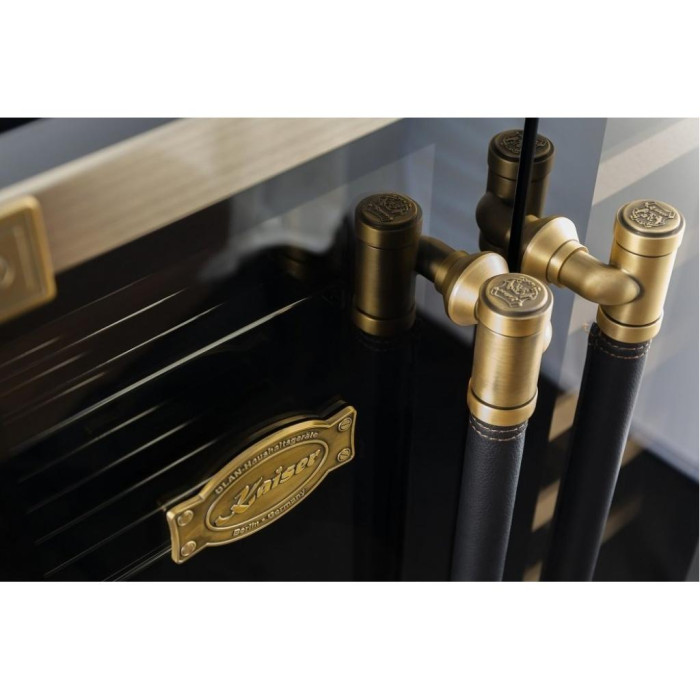 Холодильник Kaiser K64800AD выполнен в виде стильного устройства, которое предназначено для хранения алкоголя. Он имеет дизайн серии Art Deco, в котором удачно сочетается черная основа с бронзовыми акцентами. При этом его фронтальная часть сделана прозрачной, за счет чего холодильник приобретает изысканный внешний вид и открывает полный обзор на содержимое.