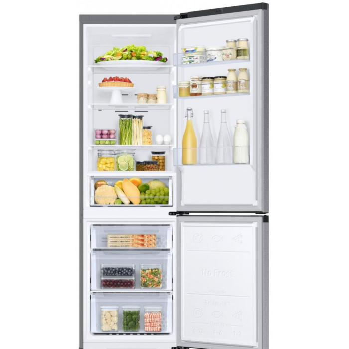 Холодильник с нижней морозильной камерой Samsung снижает температуру по технологии No Frost, поэтому выгодно отличается от моделей без такой системы. No Frost обеспечивает вентилируемое охлаждение, благодаря которому регулируется уровень влажности, отсутствует конденсат, иней, наледь, сторонние запахи и существенно продлевается срок службы холодильника.