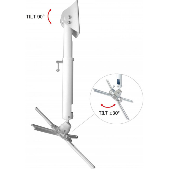 CHARMOUNT PRB45-60 White предназначен для проектора весом до 30 кг. Кронштейн крепится к потолку или к стене, дает возможность наклонить проектор от - 30 ° до + 30 ° и регулировать отступление от потолка / стены в пределах 450-600 мм. Видстинь между адаптерами регулируется от 210 до 280 мм.