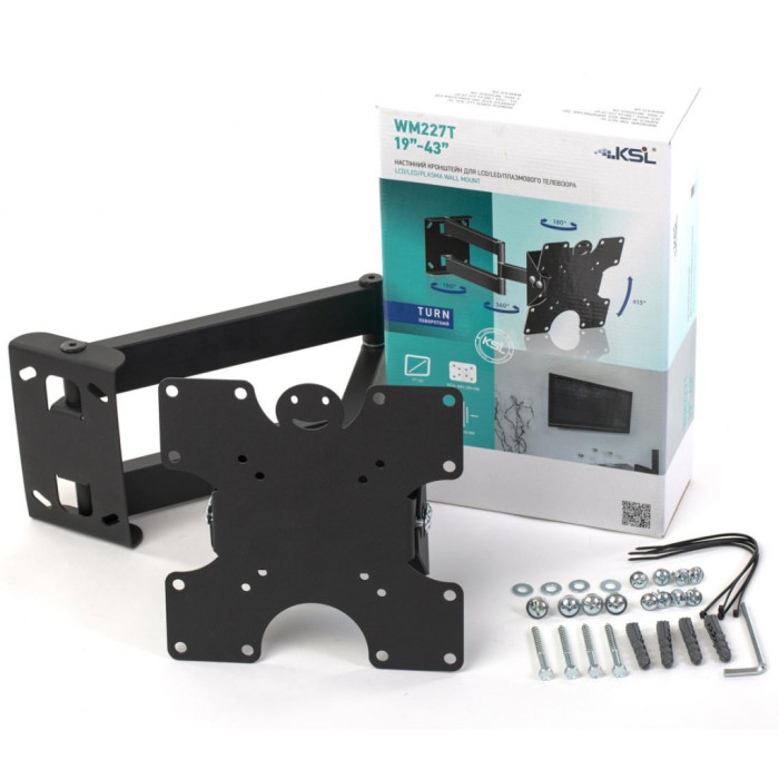Кронштейн KSL WM227T представляет собой настенное крепление для ЖК/LED/LCD телевизоров. Качественные детали кронштейна со стильной, гладкой поверхностью обеспечивают необыкновенную жесткость и устойчивость. С помощью настенного поворотного кронштейна KSL WM227T вы можете расположить телевизор с диагональю от 19" до 43" дюймов практически в любой части комнаты. Кронштейн имеет регулируемый угол наклона экрана по вертикали до 15 градусов и три регулируемых узла поворота по горизонтали для улучшения обзора с дивана, кровати и даже с пола. Он идеально подойдет в тех случаях, когда отражения от окон или осветительных приборов мешают видеть изображение на экране телевизора, либо при необходимости просмотра под несколькими углами. Кронштейн выполнен из качественных и надежных материаллов и может выдерживать нагрузку до 25 кг. В комплект входит инструкция по установке и необходимые крепежные элементы.
