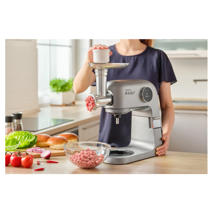 Измельчайте мясо в соответствии с вашими предпочтениямиМногофункциональный кухонный комбайн оснащен выходом для установки мясорубки. С ее помощью вы сможете приготовить фарш 3 различных степеней крупности, от самого мелкого до деревенского грубого помола. Кроме того, вы найдете насадку для наполнения оболочек и сможете игриво колдовать с ней над домашними колбасками и сосисками. Еще один гаджет - шейвер, который позволит вам в кратчайшие сроки подготовить мясо для шашлыка. Если вы предпочитаете сладкие закуски, вам наверняка пригодится насадка для резки печенья, которая легко помещается на мясорубку.