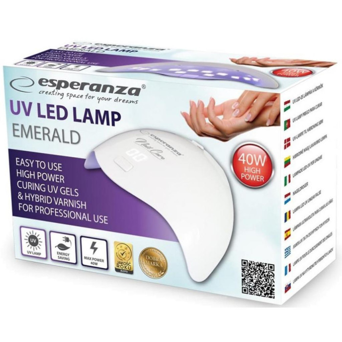 С профессиональной UV LED лампой Esperanza EBN008 вы можете забыть о частых посещениях салонов красоты и дорогих маникюрных процедурах. Лампа подходит для любых ногтевых покрытий. Лампа идеально подходит как для маникюра, так и для педикюра. Лампа оснащена 12 светодиодами общей мощностью 40 Вт, выдающими белый свет. Оснащена датчиком движения и индикатором времени. Ваши ногти будут красивыми и блестящими в течении многих дней и даже недель.