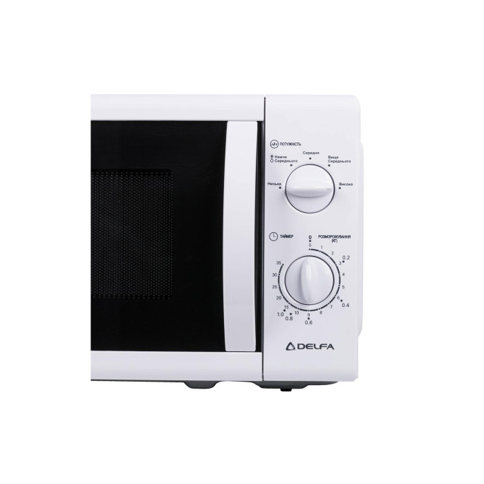Управление. Микроволновая печь Delfa MD20MGW управляется с помощью поворотных ручек, расположенных на панели. Нижняя ручка задает время приготовления, разогрева или разморозки. Верхней ручкой выбирается один из шести уровней мощности. Уровень мощности можно изменять прямо в процессе приготовления блюд. Максимальная мощность составляет 700 Вт. Максимальное время приготовления – 30 минут. Этого хватит, чтобы испечь любой пирог.
