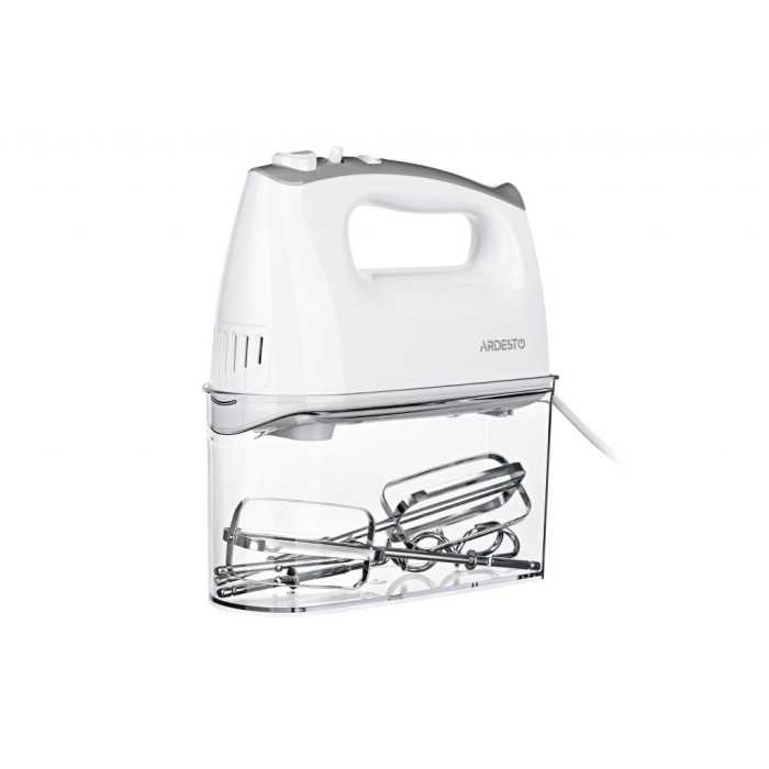 Ручной миксер для взбивания ингредиентов и быстрого замеса теста. Для удобного хранения насадок предусмотрен специальный контейнер.
