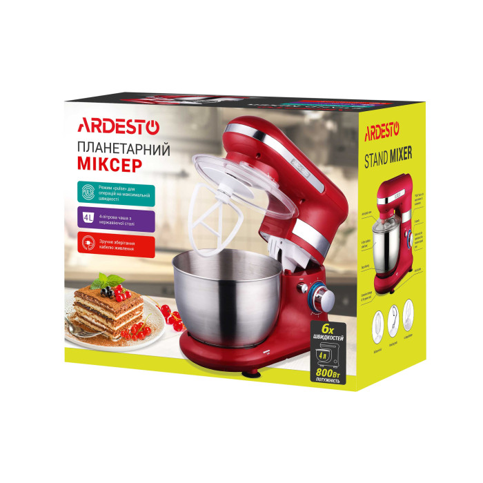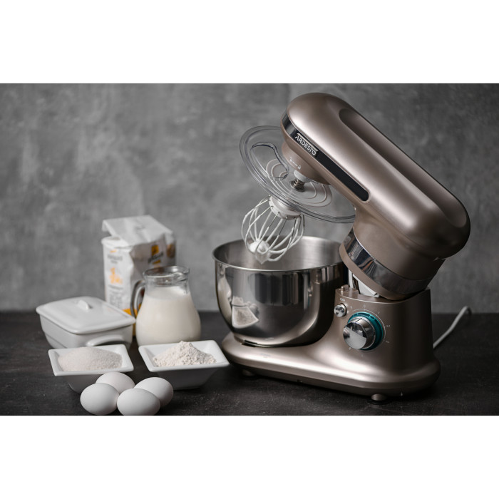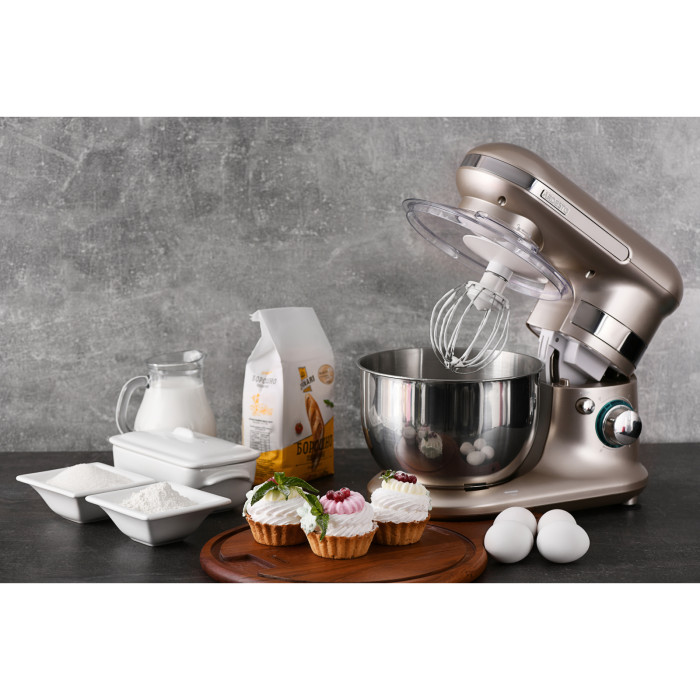 Планетарный миксер для взбивания большого количества ингредиентов и быстрого замеса теста. В комплект поставки входит чаша с крышкой, а также три типа насадки.