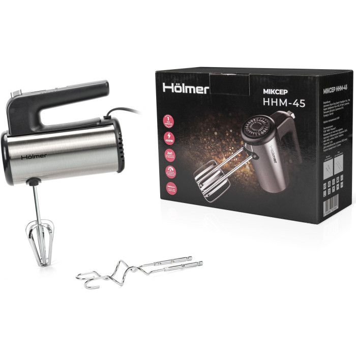 Универсальная модель ручного миксера «2 в 1» HHM-45 – ваш ежедневный помощник на кухне. За короткий промежуток времени выполняет множество кулинарных задач, делая процесс приготовления пищи быстрым и приятным. Миксер обладает мощностью 450 Вт, укомплектован венчиками для взбивания (2 шт.) и крюками для теста (2 шт.). Имеет 5 ступеней регулировки скорости и ускоренный турбо режим. Для безопасной работы устройства предусмотрена функция защиты от перегрева. Hölmer HHM-45 идеально справляется с приготовлением различных кремов, муссов, пюре, а также замесом теста любой консистенции.