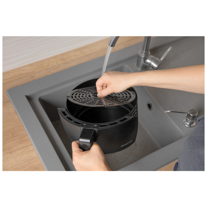 Аерофритюрница объемом 3.5 л и мощностью 1300 Вт. Готова к использованию через 3 минуты. Оснащена технологией высокоскоростной циркуляции воздуха и масляным дымовым фильтром. Съемная подставка для жарки с антипригарным покрытием для легкой очистки. Прохладная на ощупь. Автоматическое отключение