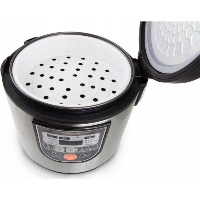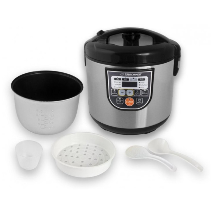 Esperanza на 5 л EKG011 – достойная модель, позволяющая значительно усовершенствовать быт современной хозяйки. Ее основное преимущество и главная отличительная особенность – наличие немалого количества программ. Она может приготовить даже тушенное мясо, рыба, овощи, рис, макароны, картофель, различную выпечку. Esperanza на 5 л EKG011 имеет в комплектации 5-литровую чашу, черпак, мерная чашка и полезные приспособления. Для Вашего удобства и безопасности, в нее встроен режим отсрочки старта, блокировка крышки, защита от перегрева и недостатка воды, автоматическое отключение. Имеет стильный серебристый-черный цвет, удобна в использовании, компактна и многофункциональна.