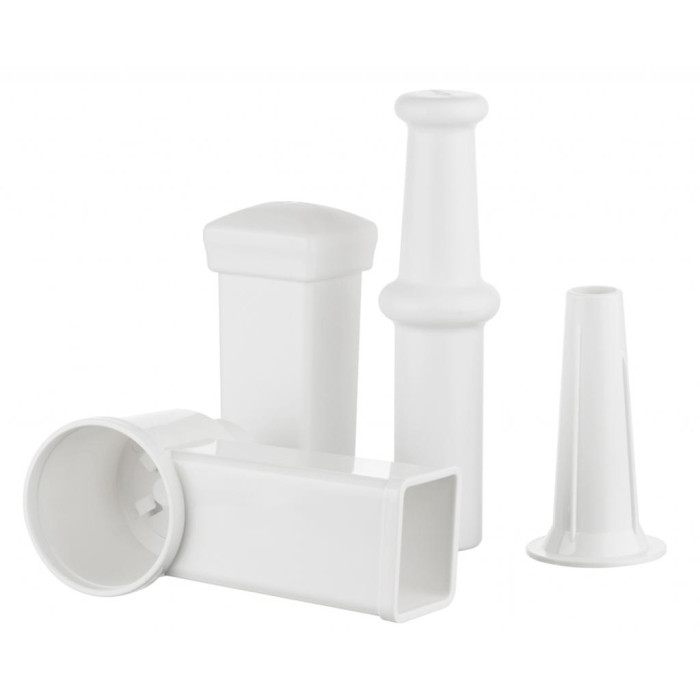 Двигатель мощностью 1800 Вт получил защиту от перегрева и функцию реверса. Производительность устройства — 2 кг мяса в минуту. Три металлические решетки рассчитаны на разную крупность фарша — 3 мм, 5 мм и 7 мм. Базовые насадки предназначены для формирования домашних колбасок и кеббе. Металлический лоток можно использовать для подготовленных ингредиентов, а проталкиватель ускорит процесс приготовления фарша. Дополнительный блок для терки и шинковки состоит из нескольких частей — трех насадок для терки разных размеров, насадки для шинковки, а также дополнительный толкатель.