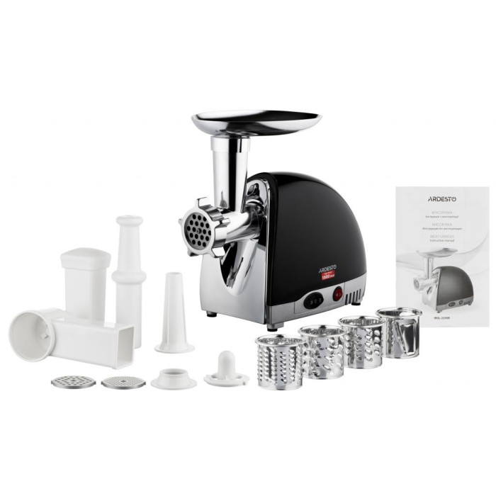 Мясорубка ARDESTO MGL-2250R с мощностью 1800 Вт, сменными насадками для приготовления фарша, домашних колбасок и кеббе, а также насадкой для терки и шинковки.