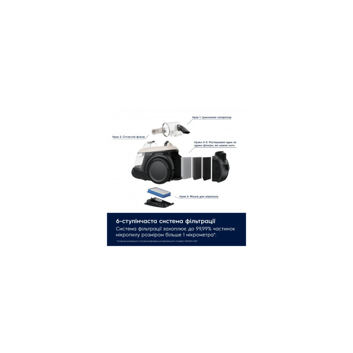 Шестиступенчатая система фильтрации удерживает до 99,99 % микрочастиц пыли размером более 1 мкм, обеспечивая лучшую очистку выходящего воздуха.*На основании внутренних испытаний в соответствии с европейским стандартом EN60312-1-2017 для частиц размером более 1 мкм.