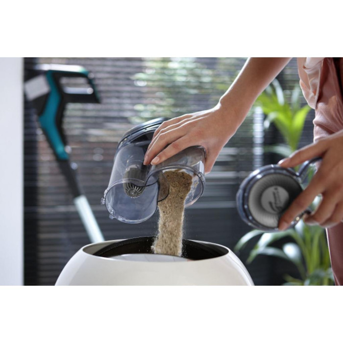 Пылесос без мешка — это легкая очистка контейнера для пыли, не касаясь и не распространяя мусор, прямо в мусорный бак.