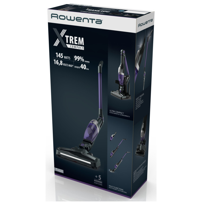 Rowenta XTREM Compact RH1238WO обеспечивает исключительную гибкость и надежную уборку в ультракомпактном корпусе. Этот инновационный беспроводной пылесос 2-в-1 был разработан, чтобы с легкостью проникать даже в самые узкие места, а двунаправленная технология Flex обеспечивает уборку в любом месте без необходимости наклоняться. Сверхкомпактная напольная зарядная база обещает легкое хранение под мебелью, в шкафах и т. д., а множество функций облегчают уборку дома.
