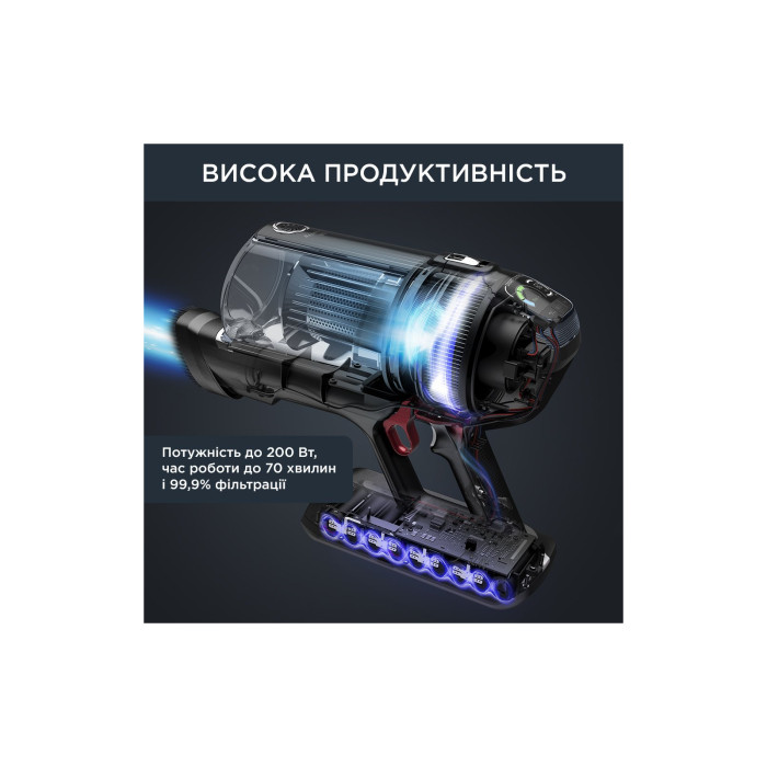 Беспроводная уборка, мощная впитываемость до 200 Вт, долговечная батарея со временем работы до 70 минут и 99.9% фильтрации мелкой пыли, аллергенов и пылевых клещей.