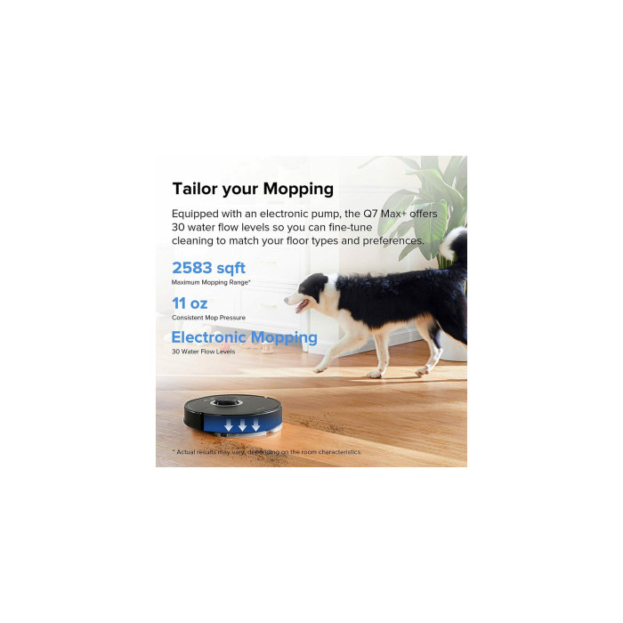Пропылесосьте и протрите шваброй полы одновременно, чтобы собрать мелкую грязь и пыль, которую можно пропустить при использовании только лишь одного пылесоса. Оснащенный электронным насосом, Q7 Max+ предлагает 30 уровней интенсивности потока воды, поэтому вы можете точно настроить влажную уборку в соответствии с типом пола и вашими предпочтениями.
