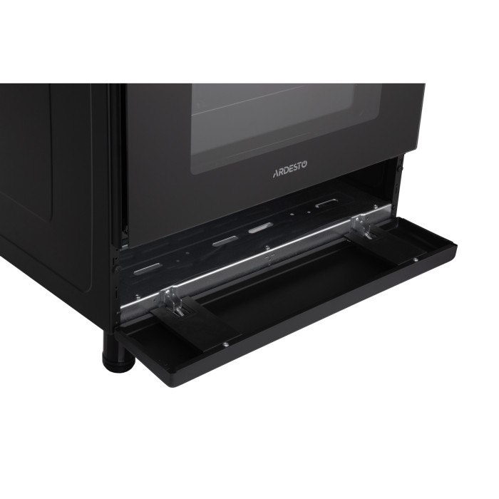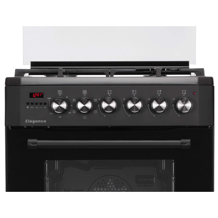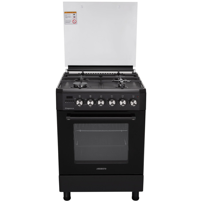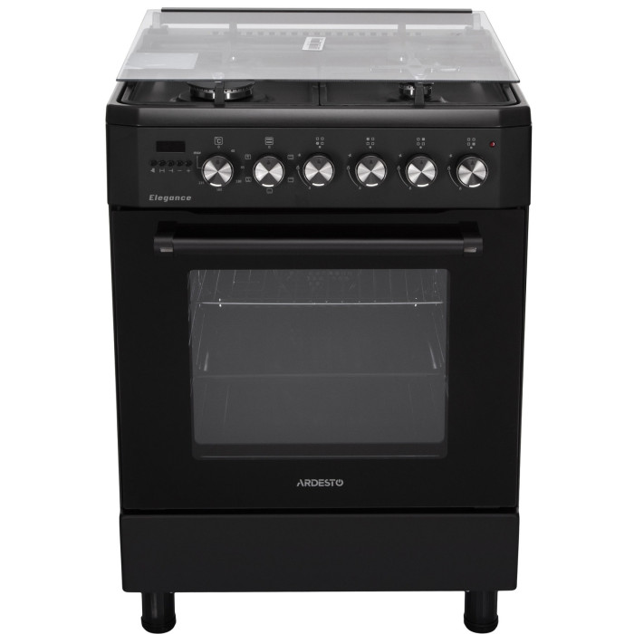 Комбинированная плита ARDESTO Elegance – это удачный дуэт газовой варочной поверхности с электрическим духовым шкафом. Общая мощность четырех газовых горелок составляет 6,6 кВт, тогда как мощность духового шкафа – 2257 Вт. Для безопасного использования плиты предусмотрен газ-контроль. Газовые форсунки: NG (G20 – 13 мбар). Также в комплекте поставки есть форсунки для сжиженного газа (LPG). Модель выполнена в минималистском черном цвете, затемнена вдоль краев стеклянная дверца духовки в центре имеет почти прозрачное окошко для лучшего обзора. Стильного акцента плите добавляют элементы из нержавеющей стали: поворотные колесики, рукоятка на дверце шкафа и горелки. Зажигание автоматическое – просто нужно нажать на поворотное колесико соответствующей конфорки.