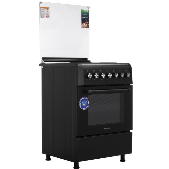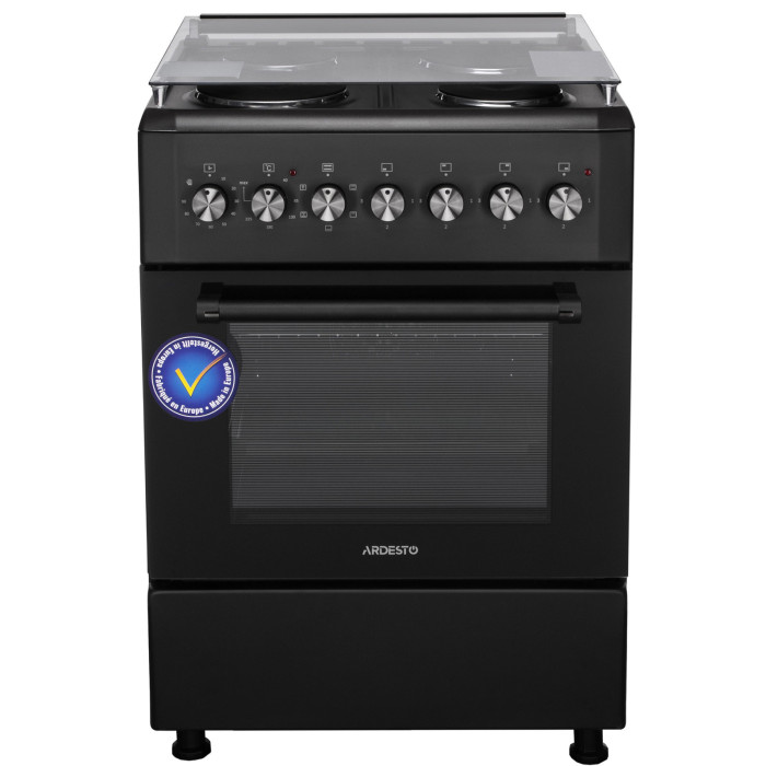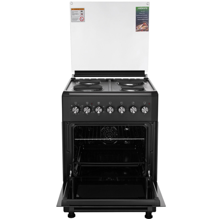 Электрическая плита ARDESTO отличается минималистским дизайном: сплошь выполнена в черном цвете, дверца имеет зеркальную, гладкую поверхность, крышку из прозрачного стекла и, как акцент, поворотные переключатели, на фронтальной стороне которых нержавеющая сталь. Модель имеет стандартный размер: 60 см в глубину также 60 см. На варочной поверхности – четыре электрические конфорки (2 × 180 мм, 2 × 145 мм). Также конструкцией предусмотрен достаточно емкий духовой шкаф 53 л с освещением.