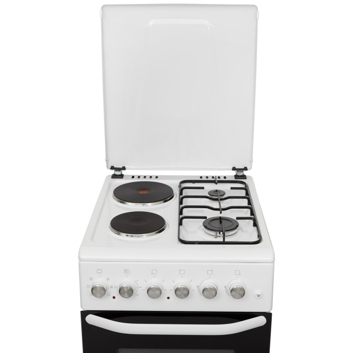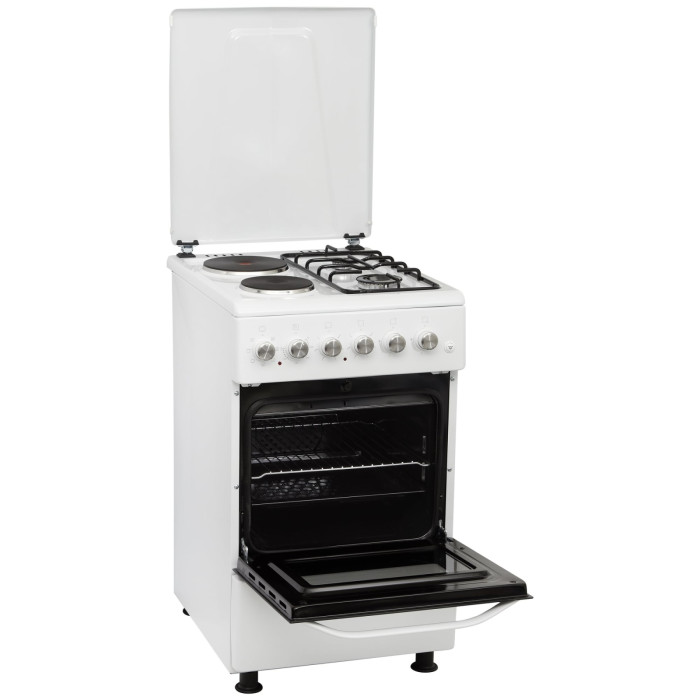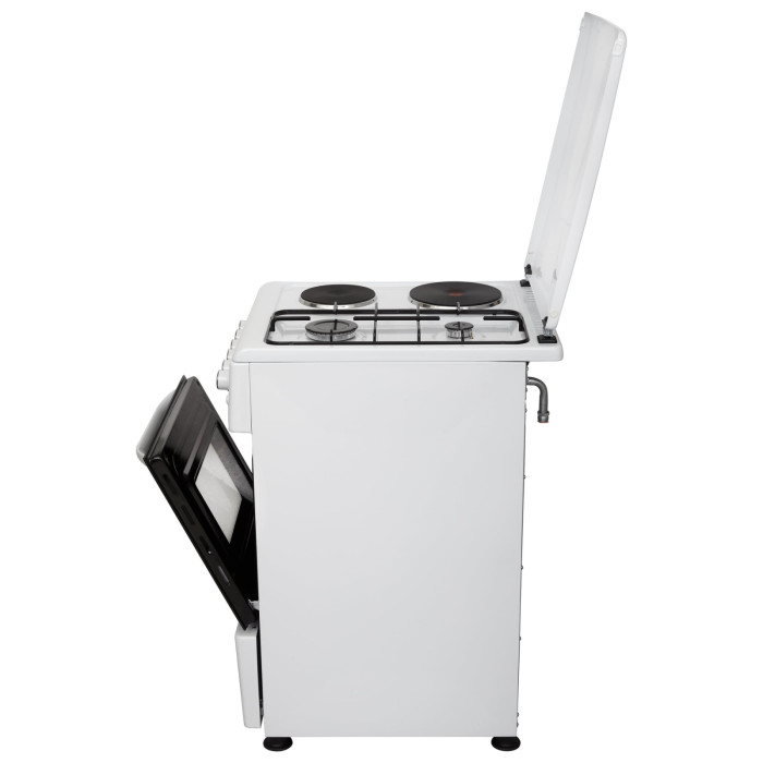 ELEYUS TWINGO 5007 H2 – кухонная плита с комбинированной варочной поверхностью и электрическим духовым шкафом объемом 52 л. Имеет защитную металлическую крышку и регулируемые ножки, чтобы изменить высоту плиты и надежно установить ее.