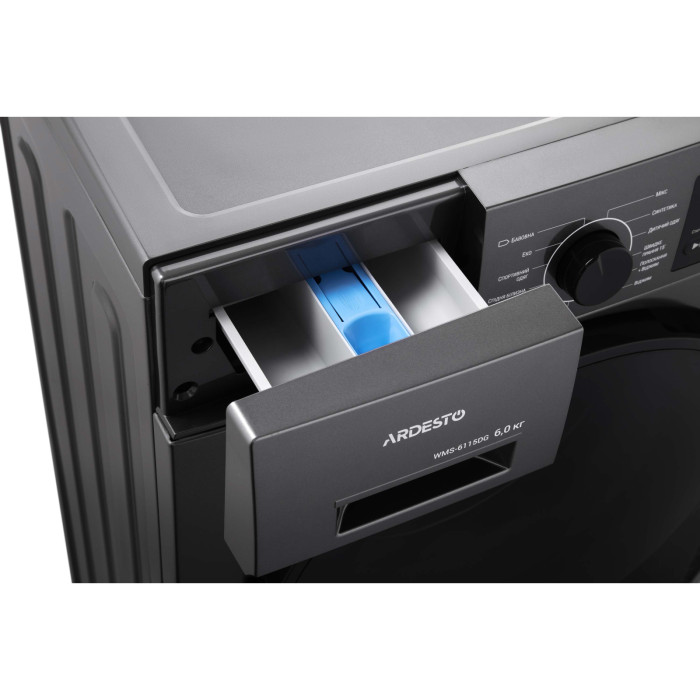 ARDESTO WMS-6115DG – автоматическая стиральная машина с фронтальной загрузкой. Современный оригинальный дизайн Black Mars подчеркивает темно-серый цвет, встроенный дисплей и большой черный люк. Способна тщательно постирать и аккуратно отжать до 6 кг белья, она непременно станет надежной помощницей в доме. Максимальную скорость вращения барабана 1000 об./мин обеспечивает двигатель мощностью 1750 Вт. Высокий класс энергоэффективности – А++, компактный размер (глубина всего 44 см) и привлекательная цена делают WMS-6115DG действительно выгодным приобретением.