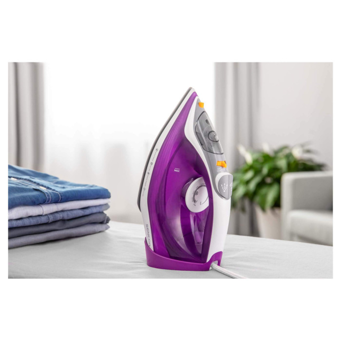 Высокопроизводительная паровая система с паропроизводительностью 30 г / мин. Керамическая подошва. Легко заполняемый прозрачный резервуар для воды объемом 260 мл. Постоянный контроль температуры. Система самоочистки для удаления минеральных отложений