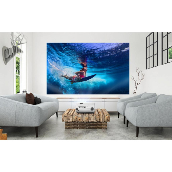 С помощью этого Full HD проектора для домашнего кинотеатра вы можете наслаждаться изображением на большом экране до 332 дюймов (762 см). Он качественно передаёт самые атмосферные сцены с глубоким черным цветом и четкими деталями в тенях, может увеличивать яркость в тёмных областях изображения за счет коррекции тёмной гаммы и поддерживает формат изображения 21:9, который используется в компьютерных играх.