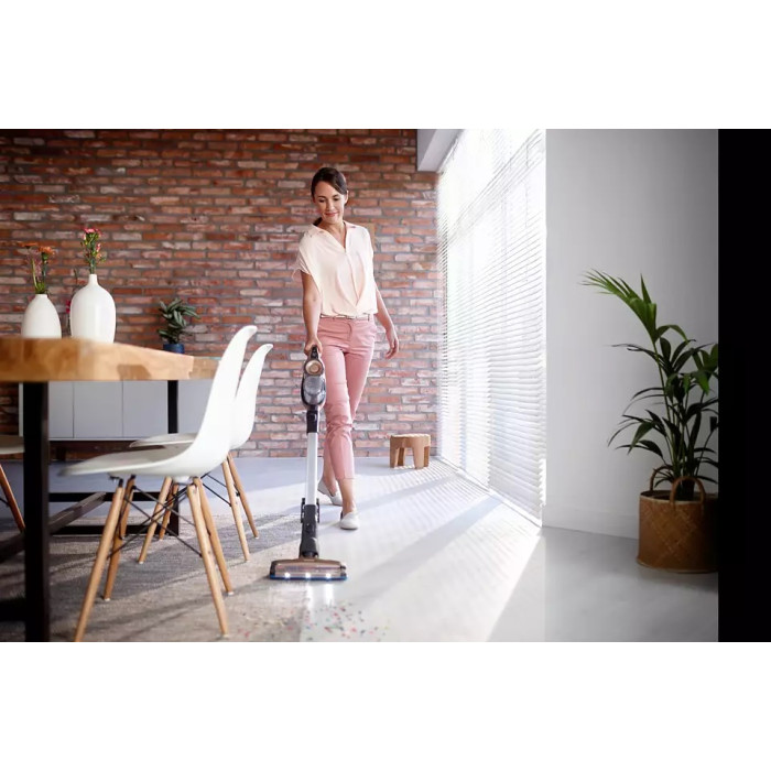 SpeedPro Max гибок и прост в маневрировании. Контейнер для пыли расположен в верхней части устройства, что позволяет поддерживать меньший угол наклона к полу и даже пылесосить в полностью плоском положении, чтобы добраться до пространства под низкой мебелью.