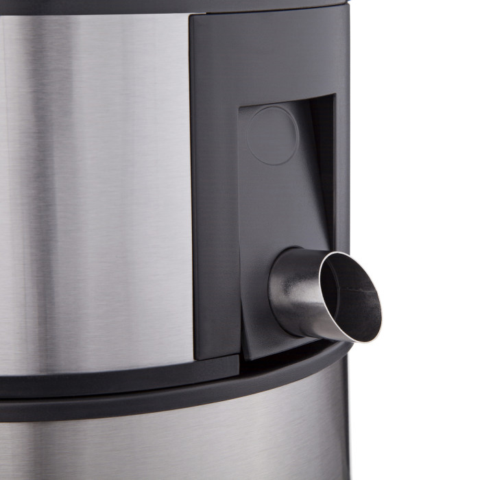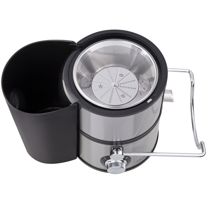 Капля-стоп. Для экономии времени приготовления, соковыжималка получила отверстие 65 мм и толкатель для загрузки целых ингредиентов, например яблок. Также, предусмотрено наличие автоматической системы отброса мякоти. Есть функция капля-стоп и в комплектацию входит 1,5 литровый съемный контейнер. Этой емкости достаточно для продолжительной работы соковыжималки. Для сока, есть специальный контейнер из сепаратором пены.