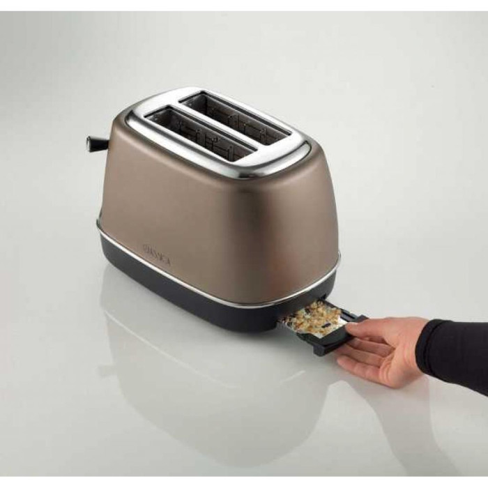 Компактный и элегантный дизайн, оснащенный автоматическим выбросом тостов, съемным поддоном для крошек, 6 регулируемыми уровнями подрумянивания, ненагревающимися стенками и функцией поджаривания, нагреванием и размораживанием.