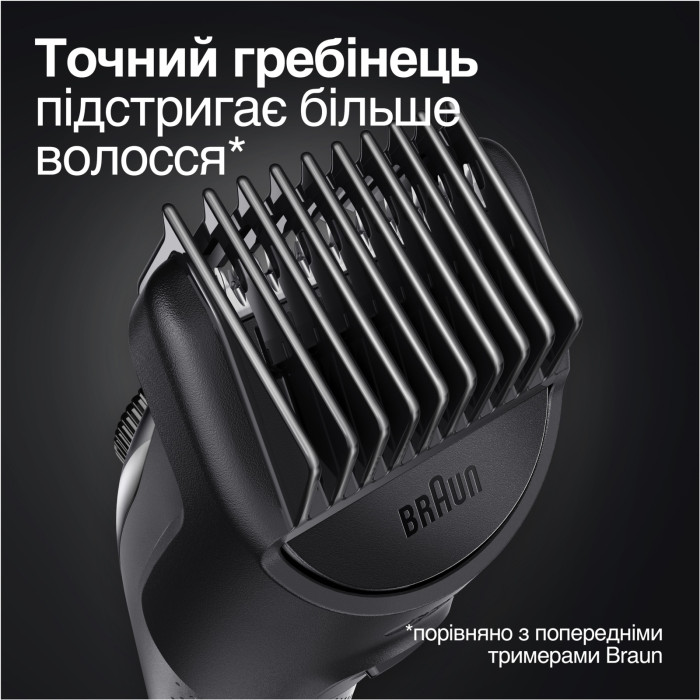 Триммер для бороды Braun 3 имеет большую режущую поверхность, захватывая и подравнивая больше волос при каждом движении.