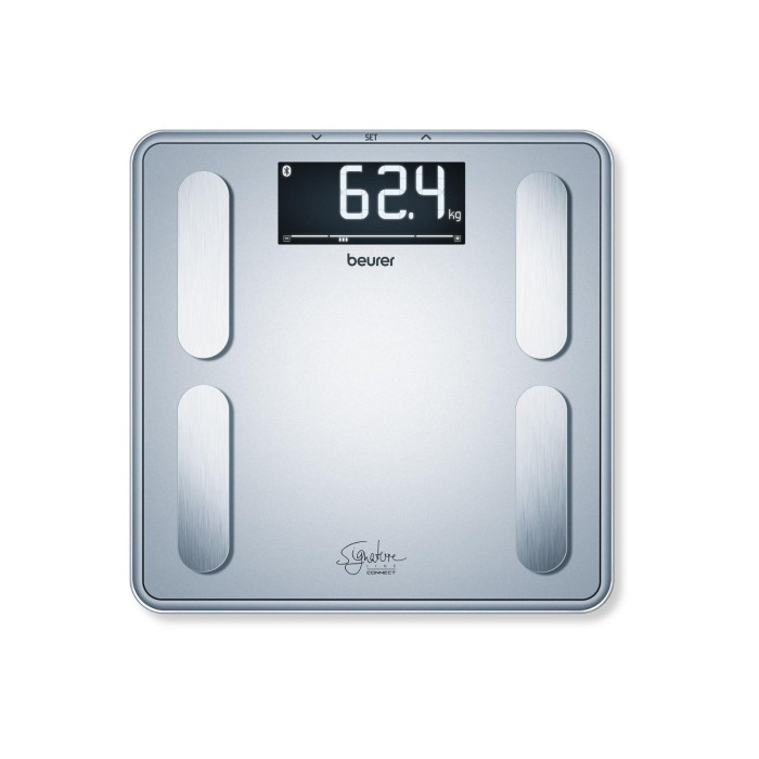 Диагностические весы Beurer BF 405 с увеличенным максимальным весом, большими цифрами и интерпретацией результатов. Определяют вес тела, жировую массу, содержание воды в организме, мышечную массу, костную массу, определяют обмен веществ и уровень физической активности (BMR/AMR), рассчитывают индекс массы тела.