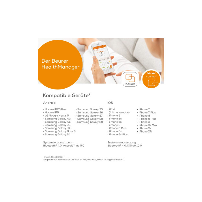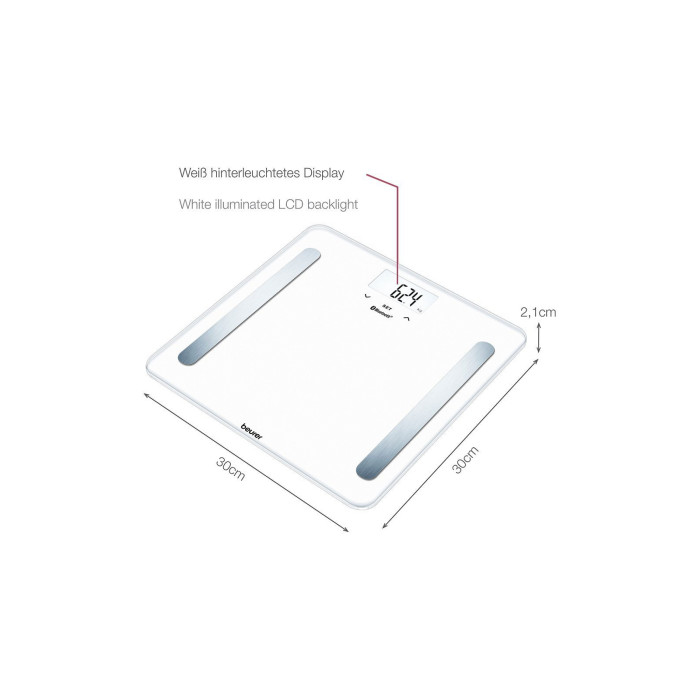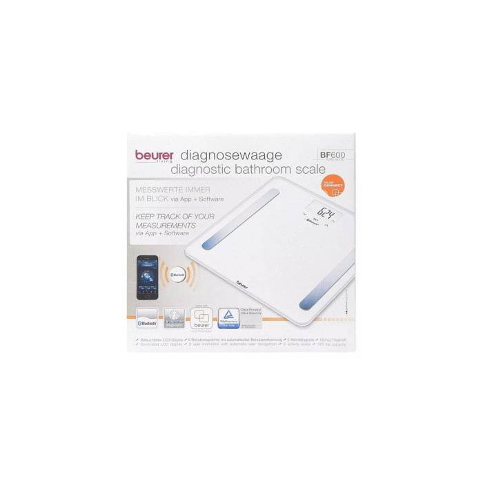 Инновационные напольные весы Beurer BF 600 Pure Black с беспроводным подключением к смартфону или планшету. Благодаря технологии Bluetooth low energy результаты измерений и данные о ваших физических показателях всегда с вами – дома, в пути, в путешествиях. Для оптимального контроля веса загрузите Beurer HealthManager через App Store или Google Play. Напольные диагностические весы, кроме простого взвешивания, позволяют определить часть жировой массы, тканевой жидкости, мышечной и костной массы, индекс массы тела